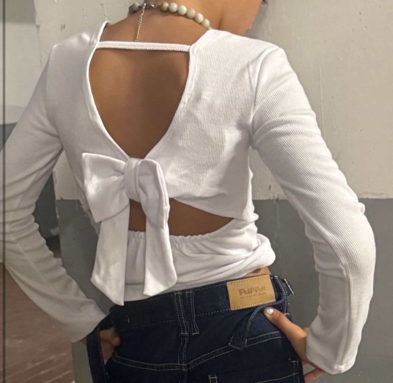 חולצה פפיון בגב לבנות בעיצוב ייחודי שמשדר עדינות וסטייל. הגזרה הצמודה מקדימה יחד עם הפתיחה בגב והקשר המעוצב יוצרים לוק מרשים ומלא שיק.